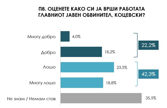 Во однос на работата на државниот јавен обвинител Љупчо Коцевски 42,3 отсто од испитаниците дале негативна оценка за неговата работа, а 22,2 отсто оцениле дека тој добро си ја врши работата.