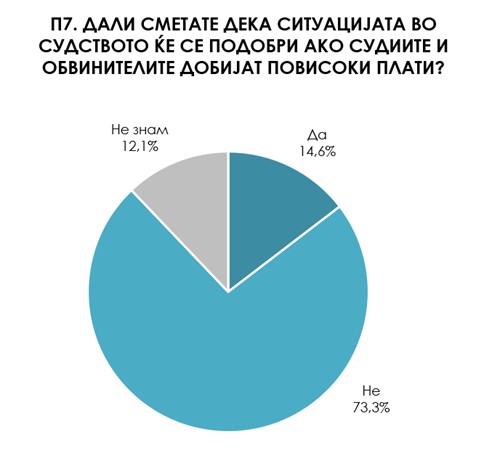 На прашањето дали судиите и јавните обвинители заслужуваат зголемување на платите, дури 73,6 отсто од испитаниците одговориле негативно. Само 14,8 отсто од испитаниците сметаат дека зголемувањето на буџетот за македонското правосудство е заслужено.