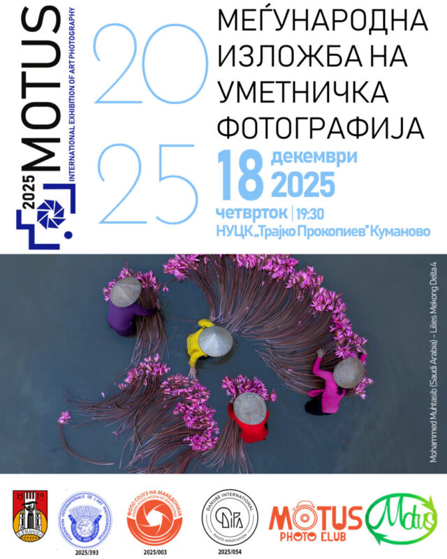 Здружението за промоција на интелектуални, мултикултурни и спортски вредности – Мотус од Куманово, преку својот Фото клуб – Мотус, во период од 18 декември (четврток) 2025 во просториите на Центар за култура „Трајко Прокопиев“ во Куманово, ќе ја организира втората Меѓународна изложба на уметничка фотографија Мотус 2025.