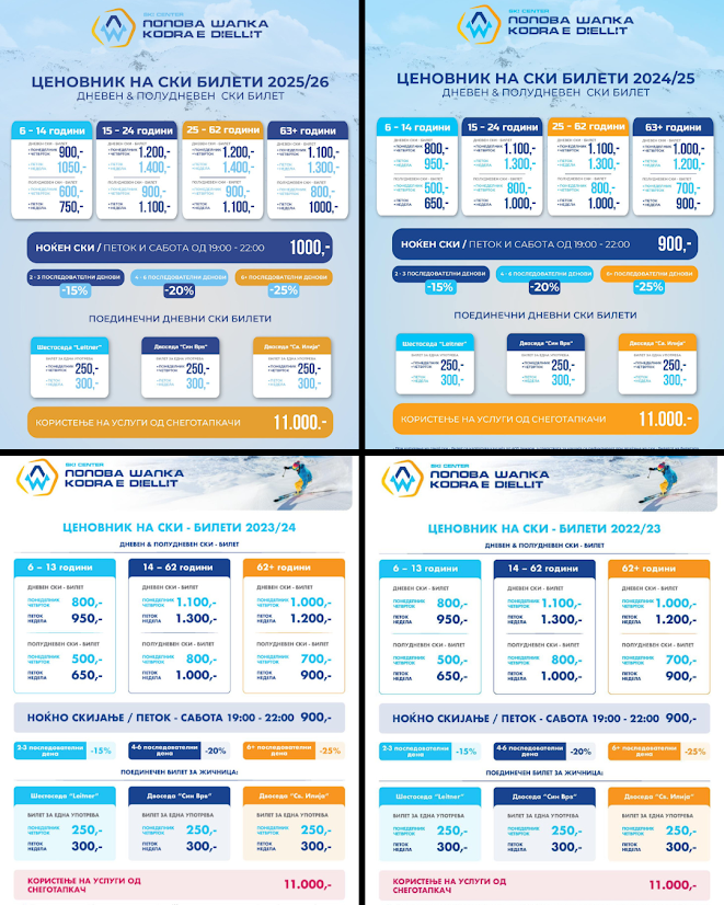 Скијачката сезона 2025/26 на Попова Шапка започна со зголемување на цените на дневните и сезонските билети. Во меѓувреме, сезонскиот билет не покрива и ноќно  скијање, за што се жалат скијачите, а според раководството на ски центарот, за ноќно скијање потребни се дополнителни ангажмани и трошоци, пишува Порталб.мк.