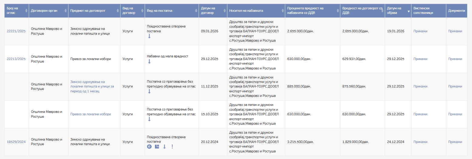 Општина Маврово и Ростуше потпишала два договори. На 11 декември 2025 година потпишала договор со Балкан Турс во вредност од 742.000 денари без ДДВ. А на 9 јануари 2026 година повторно е потпишан договор со Балкан Турс во вредност од 2.250.000 денари без ДДВ. Овие договори достигнуваат вкупна вредност од 2.992.000 денари (над 48 илјада евра). Општина Маврово и Ростуше потпишала два пати договор со оваа компанија. Во 2025 година за превоз за време на изборите, а договор потпишала и во 2024 година за зимско оддржување на патиштата.