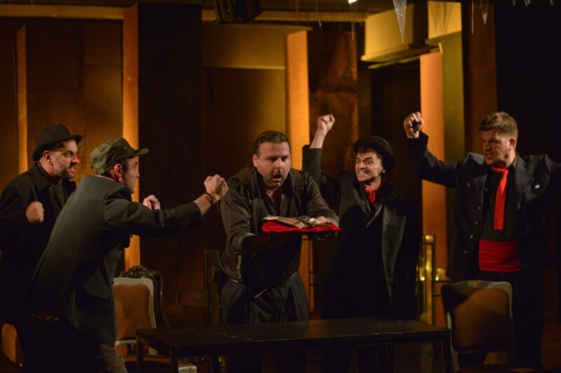 Во претставата играат: Како Неда, Сара Спиркоска, во улогата на Иван, Бобан Алексоски, Катерија Чакмакоска-Клинческа како Милка, Александар Степанулески како Луков, Христов го игра Александар Тодески, ликот на Фезлиев е Димитар Ѓорѓиевски, како Методи, Михајло Миленкоски, Младичот е Илија Волчески, како и децата Иво Ачански, Ангелина Тодеска, Давид Кочоски и Ива Малинческа.