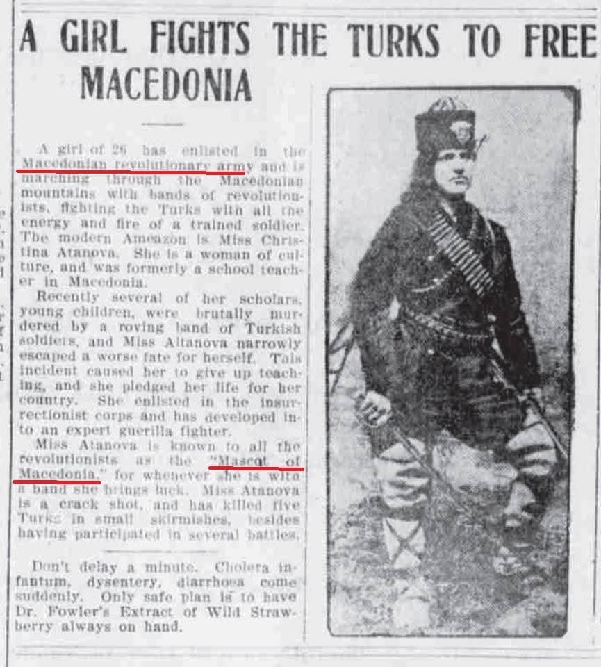 „26-годишна девојка се зачлени во македонската револуционерна армија и сега маршира низ македонските планини заедно со револуционерните чети, борејќи се против Турците со сета своја енергија и оган што ги има секој еден обучен воин. Госпоѓа Кристина Атанова е модерната Амазонка. Таа е жена од културата, поранешна учителка во Македонија. Пред извесно време неколку нејзини ученици, млади деца, биле ѕверски убиени од распашана чета на турски војници, а Атанова едвај се спасила. Овој инцидент ја натера да се откаже од учителствувањето, и таа ѝ се посвети на својата земја. Се приклучи на востаничките одреди и стана професионален герилски борец. Г-ѓа Атанова меѓу револуционерите е позната како ‘Амајлијата на Македонија’, од причина што кога таа била со својата чета им носела среќа. Таа е брза и прецизна пиштолџика, и во своите неколку битки досега убила петмина Турци“, е содржината на текстот под насловот „Девојка се бори со Турците за ослободување на Македонија“.