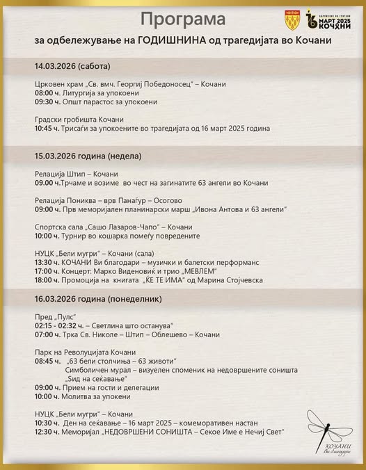 Општина Кочани во соработка со Здружението на граѓани „16 март 2025 Кочани“ во кое се сплотени родителите организираат заедничко одбележување. Родителите и покрај болката и тагата со која се носат собраа сили да учествуваат достоинствено да се одбележи настанот – Денот на сеќавање 16.03.2025 година. Поканите до сите амбасади ги испратиле од здружението и дел од планираните активности во програмата се во нивна сопствена режија и на нивен трошок.