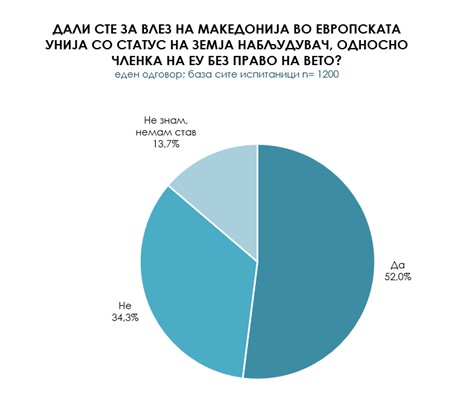 Дали сте за влез на Македонија во ЕУ со статус на земја набљудувач, односно членка на ЕУ без право на вето? Повеќе од половина (52%) од испитаниците изјавиле дека се за влез на Македонија во ЕУ без право на вето.