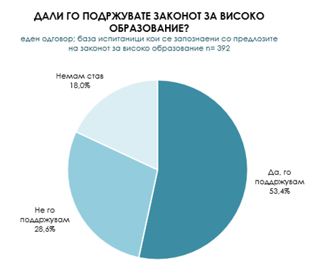 Една третина од испитаниците се запознаени со прелозите на законот за високо образование. Од нив, повеќе од половина го поддржуваат законот за високо образование, 28,6% не го поддржуваат, додека 18% немаат став.