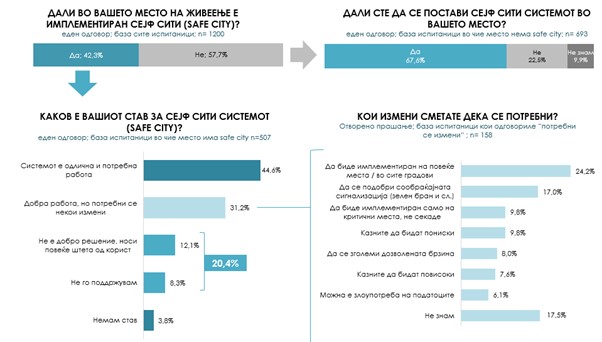 За проектот Безбеден град на МВР, најголем дел од испитаниците (44,6%), во чие место на живеење е применет овој проект, сметаат дека системот е одлична и потребна работа. 31,2 отсто од испитаниците сметаат дека системот е добра работа, но потребни се измени, додека 20,4% не го поддржуваат овој проект. Најчесто наведувана предлог промена за Безбеден град е примената на системот на повеќе места и во повеќе градови.