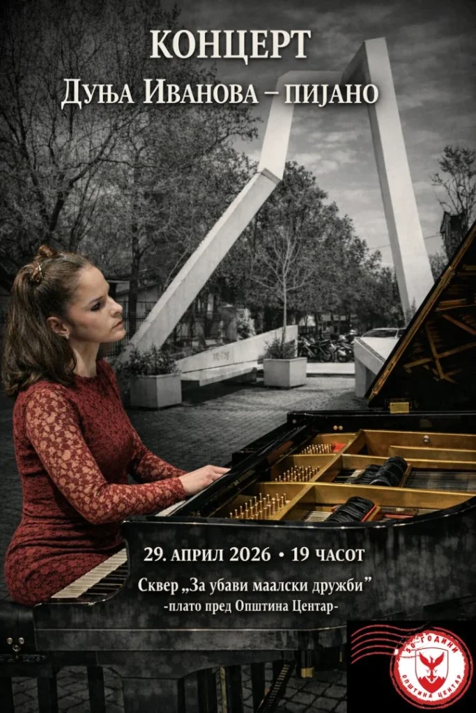 Во рамки на програмата за култура на Општина Центар, на 29 април (среда) пијанистката Дуња Иванова ќе одржи концерт под отворено небо со почеток во 19 часот на скверот „За убави маалски дружби“, пред платото на Општина Центар.