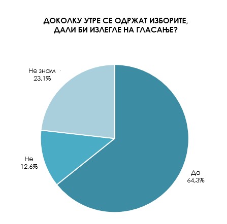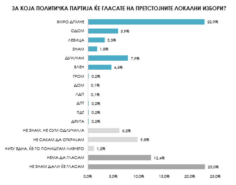 За тоа за која политичка партија ќе гласаат, 22,9 отсто се определиле дека нивен фаворит ќе биде ВМРО-ДПМНЕ, а за СДСМ би гласале само 5,9 отсто од испитаниците. Околу 40 отсто од испитаниците сѐ уште не одлучиле за која партија би гласале или не сакаат да откријат или сѐ уште не одлучиле дали ќе излезат на гласање.