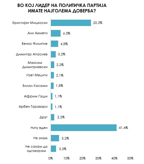 На прашањето во кој лидер на политичка партија имате најголема доверба, 25,3 отсто од испитаниците одговориле позитивно за Христијан Мицкоски, претседателот на ВМРО-ДПМНЕ. Претседателот на ДУИ Али Ахмети е на второ место, со предност пред претседателот на СДСМ Венко Филипче (6,3% : 4,8%). Интересно е и тоа дека вкупниот резултат на сите претседатели на македонските политички партии е помал од бројката за довербата што ја има лидерот на ВМРО-ДПМНЕ Христијан Мицкоски.