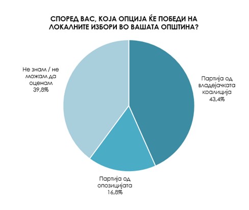 Во однос на можниот победник на претстојните локални избори за 43,4 отсто од испитаниците нема никаква дилема дека во нивната општина ќе победи партија од владејачката коалиција, а само 16,8 отсто од нив веруваат во победата на опозицијата.