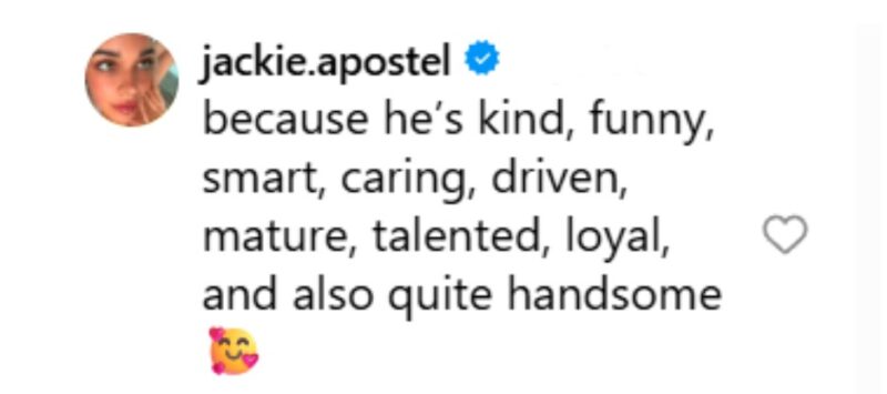 „Затоа што е љубезен, забавен, шармантен, грижлив, амбициозен, зрел, талентиран, лојален и прилично убав“, напиша таа отворено на Инстаграм, покажувајќи што навистина чувствува за него.