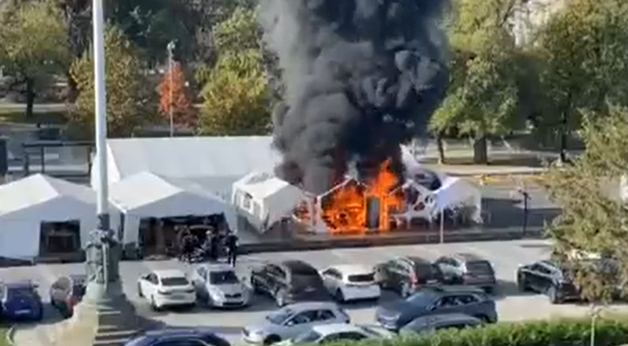 Утрово нешто по 10 часот избувна пожар во т.н. „Ќацленд“, шаторот поставен пред Собранието на Србија на „Студентите кои сакаат да учат“, при што се слушнале и пукотници, а една личност била уапсена, јавува Н1.
