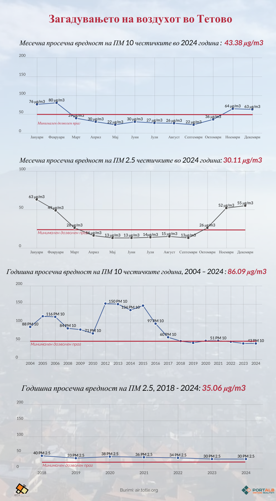 Месечна просечна вредност на ПМ 10 честичките во 2024 година: 43.38µg/m3