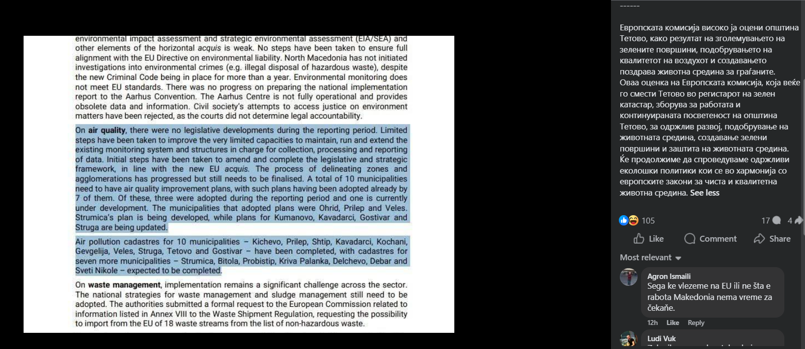 Во Извештајот на Европската комисија за напредокот на Северна Македонија, Општина Тетово се спомнува само еднаш, и тоа за завршување на катастарот за загадувачи на воздухот, а не како што напишале од Општина Тетово во својата објава, без да даде никаква евалуација или пофалба за политиките за животната средина.