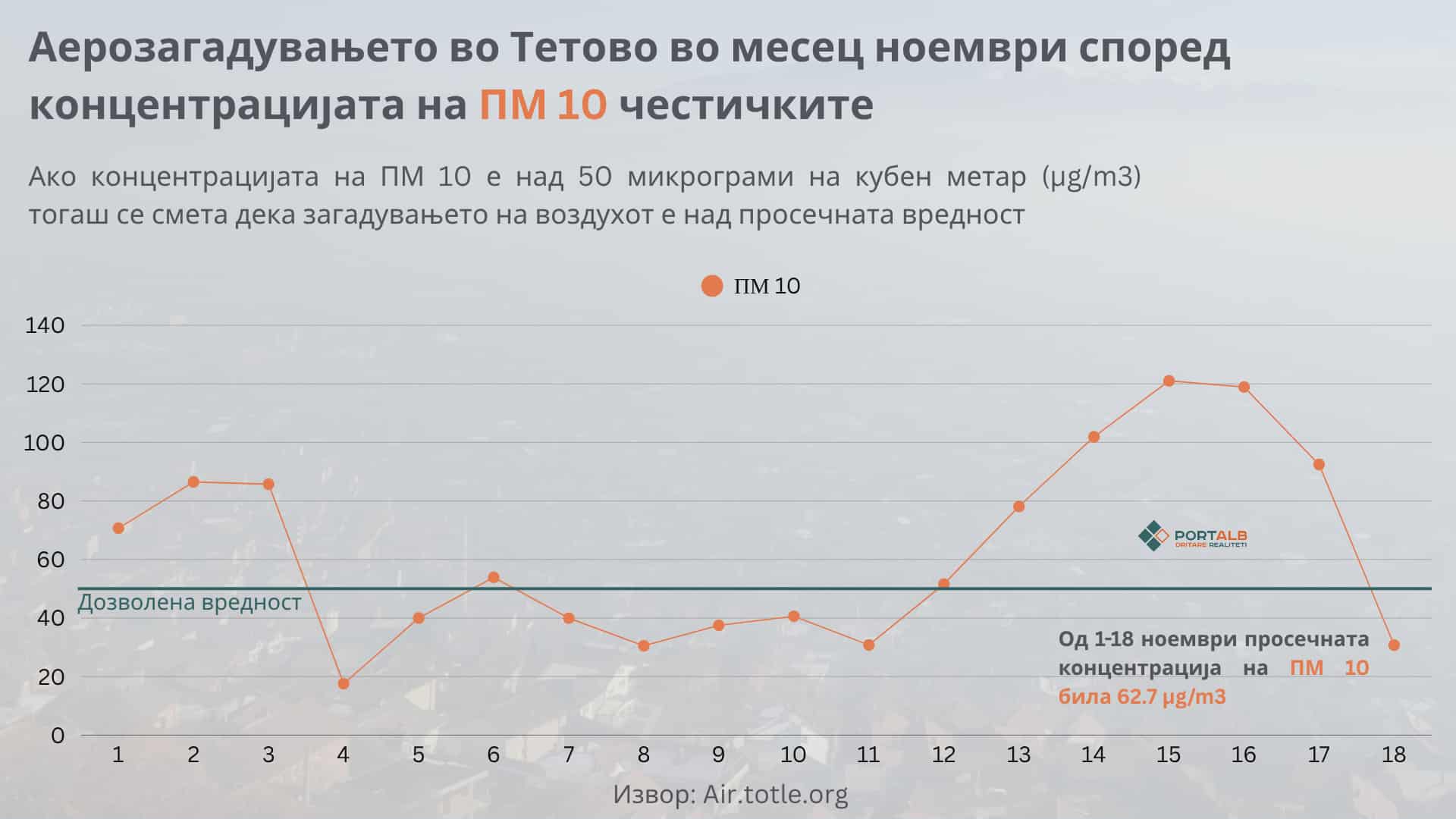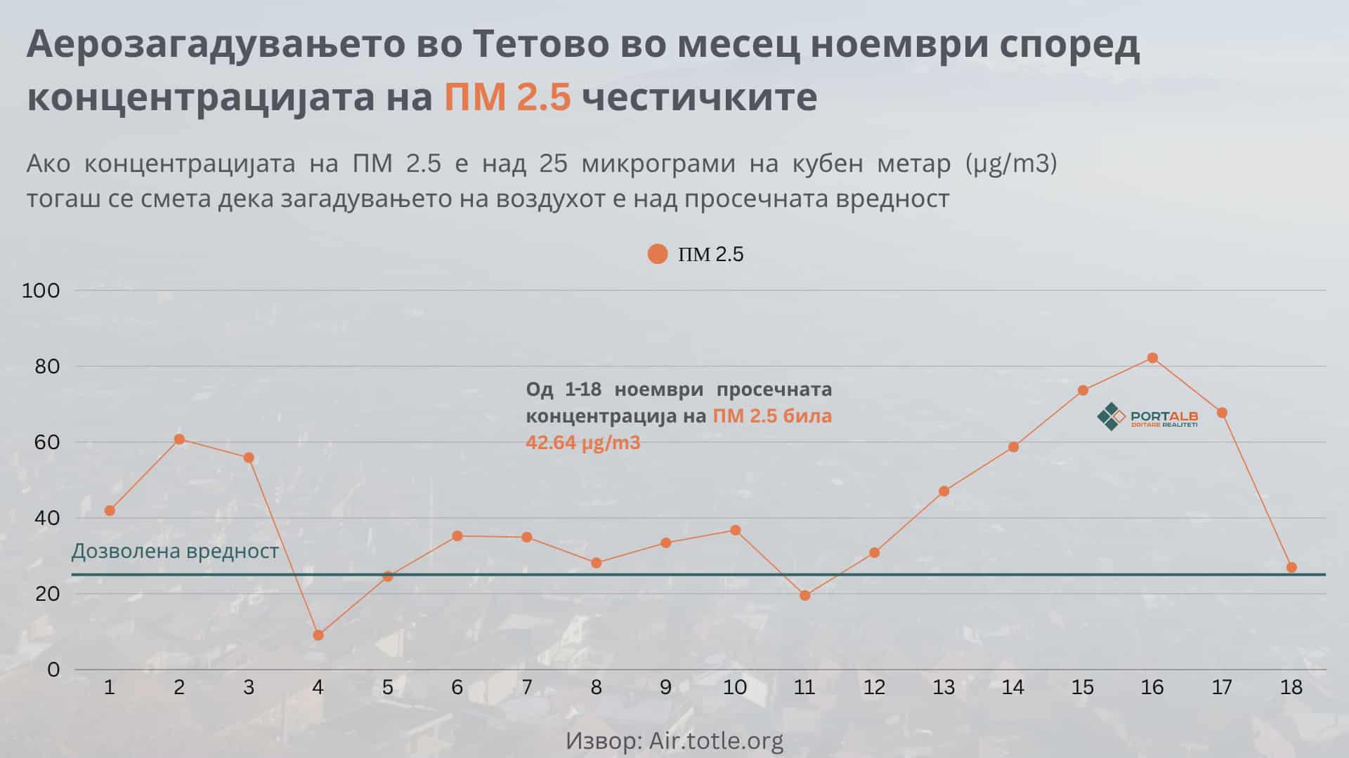 Во повеќето денови во ноември воздухот во Тетово беше загаден, при што беше надминат прагот на алармирање. Од 1 до 18 ноември просечната концентрација на ПМ 10 честичките била 62.7 микрограми на кубен метар (μg/m3), при што дозволената просечна дневна вредност на ПМ10 е 50 μg/m3. Просечната регистрирана концентрација на ПМ2.5 честичките е 42.64 μg/m3 од дозволената вредност од 25 μg/m3, пишува Порталб.мк.